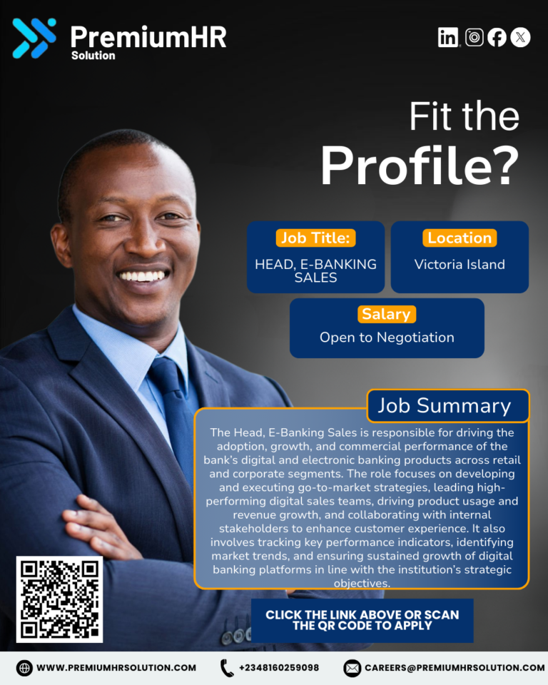 The Head, E-Banking Sales will lead the development and execution of digital sales strategies, oversee performance management across key e-banking metrics, and collaborate with internal stakeholders to enhance product design and customer experience. This role offers a unique opportunity to shape the commercial success of the institution’s digital banking agenda in a highly regulated environment.